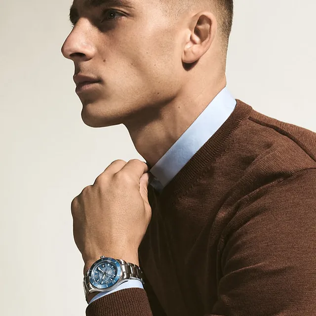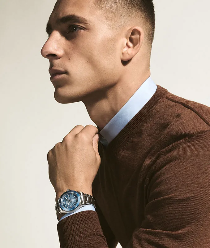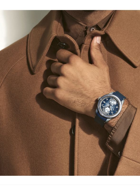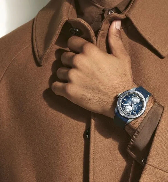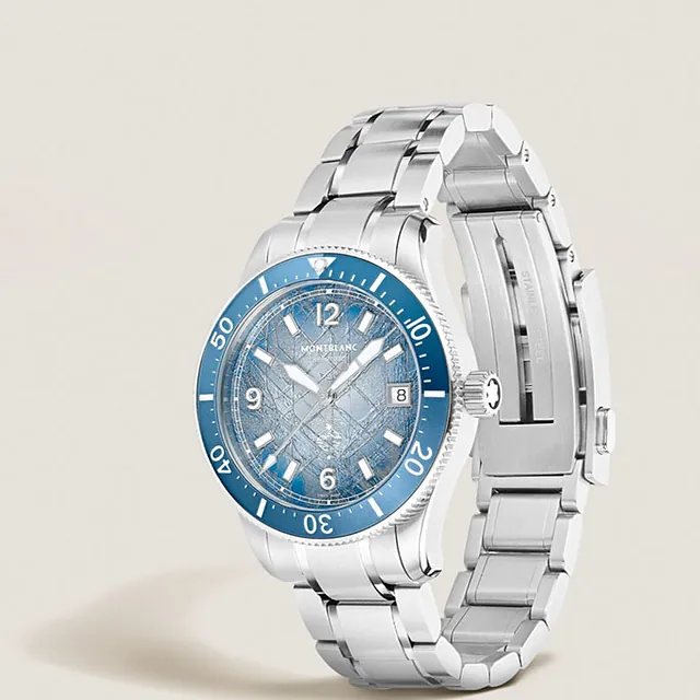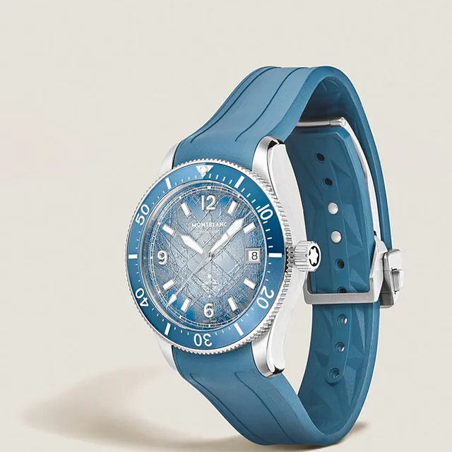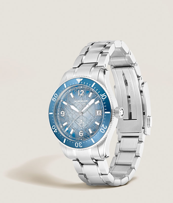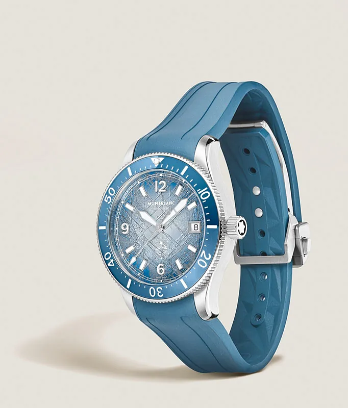 Dieses Modell mit blauem Zifferblatt mit Sfumato-Gletschermuster vermittelt den Eindruck, in die Tiefen eines Gletschers einzutauchen.