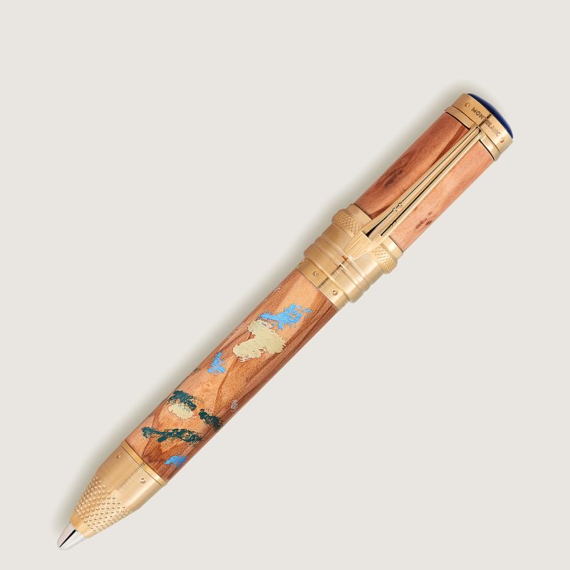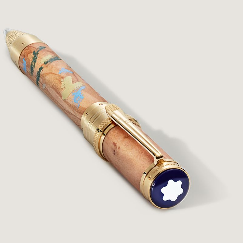 Die Edition zeichnet sich durch exquisit ausgewählte Materialien aus: Korpus und Kappe bestehen unter anderem aus Olivenholz, eine Hommage an die alten Olivenbäume, die Renoir in seinem Garten in Südfrankreich malte. Ergänzt wird das natürliche Holz durch kontrastreiche Farbverläufe, feine Lackdetails und vergoldete Beschläge. Besonders markant ist der Clip in Pinsel-Form – eine direkte Referenz auf die Werkzeuge, mit denen der Maler feine Striche und ausgedehnte Flächen gleichermaßen gestaltet.